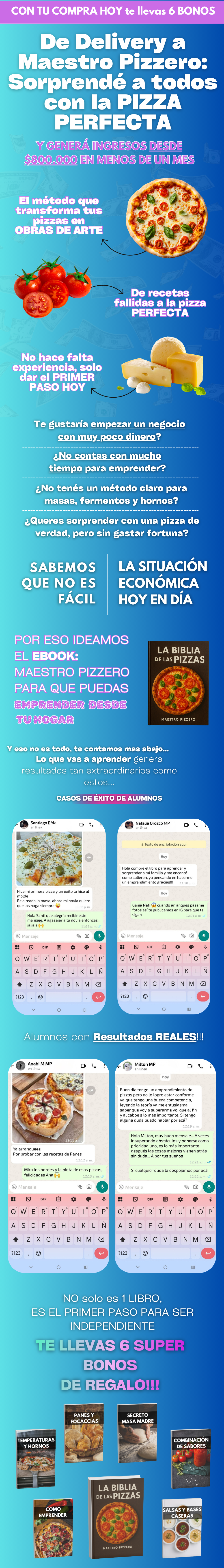 “Siempre me salían las pizzas duras o sin gusto. Con La Biblia de las Pizzas entendí cómo manejar la fermentación y los tiempos. Ahora mis hijos me piden pizza todos los fines de semana y hasta mis vecinos me encargan. ¡Vale cada página!”